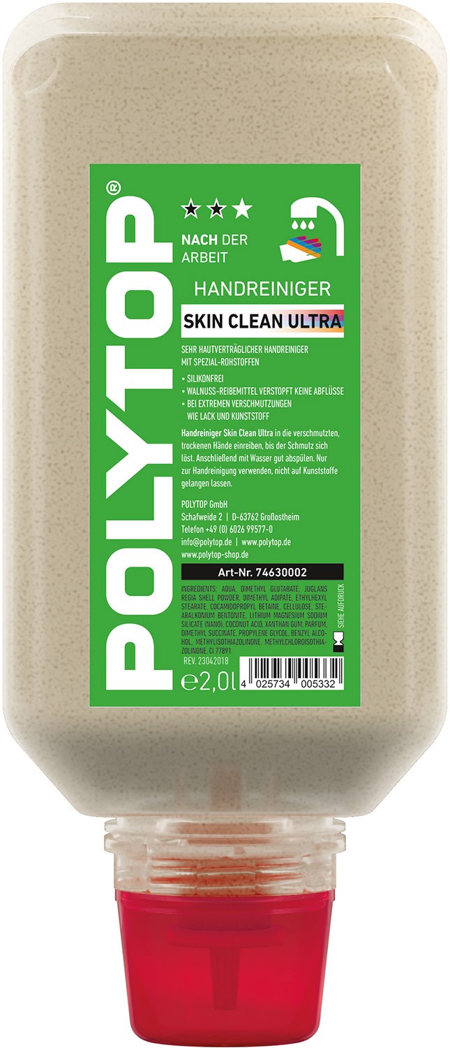 Handreiniger Skin Clean Ultra vereinigt ausgezeichnete Reinigungsleistung mit einer sehr guten Hautverträglichkeit. Enthält Kokosfett und weitere naturbasierte Rückfettungskomponenten. Das umweltfreundliche Reibemittel besteht aus fein vermahlenem Walnussschalenmehl, was ein Verstopfen der Abflüsse verhindert.