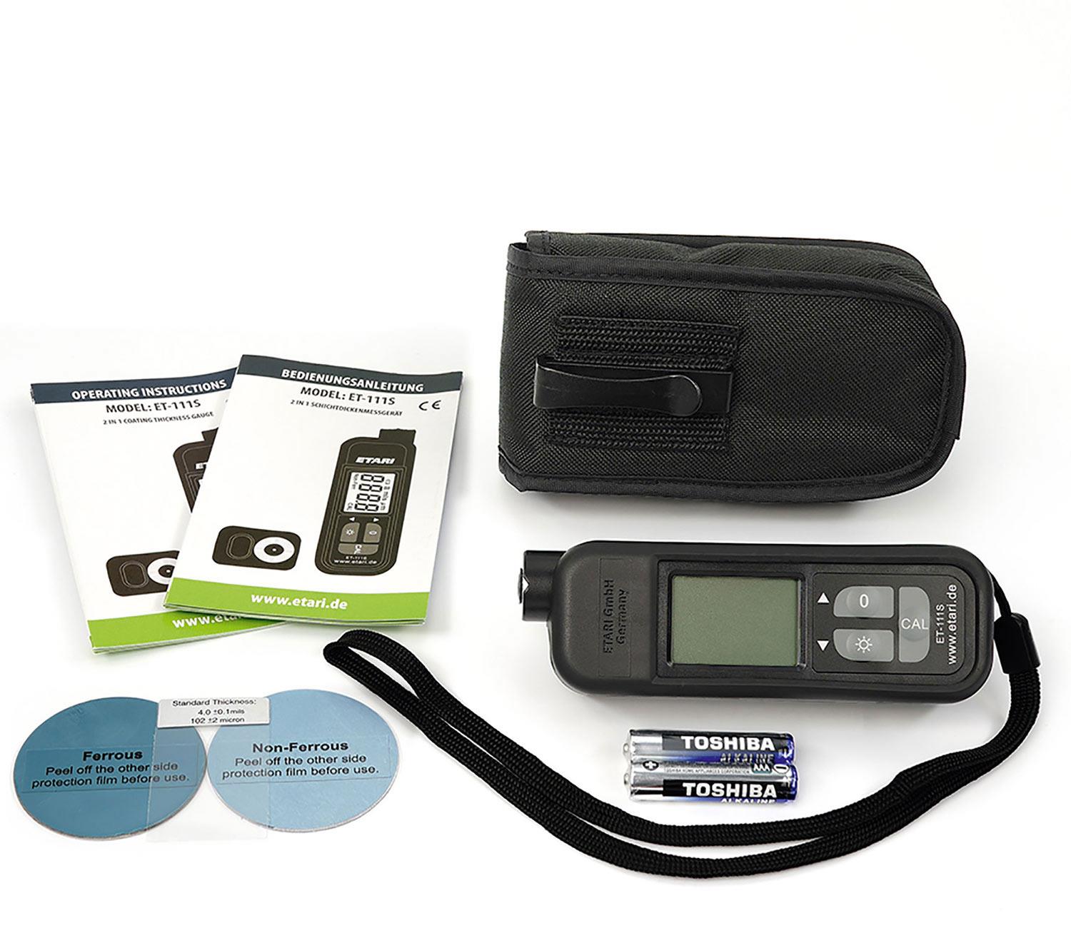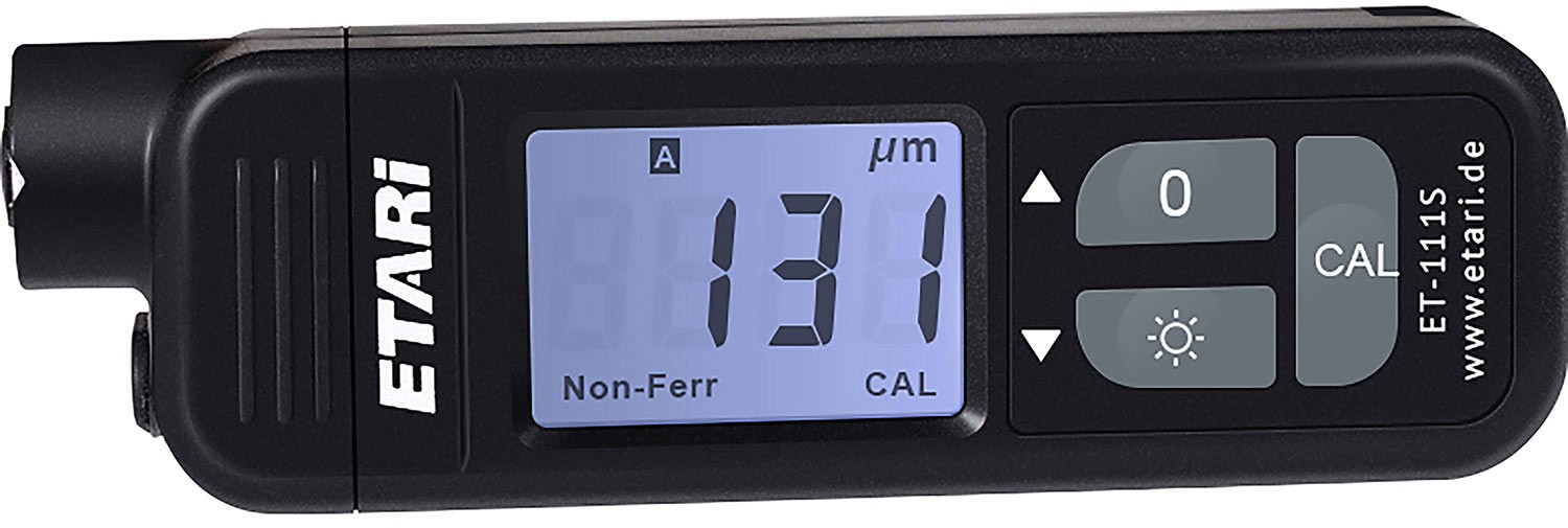 Das handliche und einfach anwendbare Schichtdickenmessgerät ETARI ET-111s ermöglicht eine zuverlässige und schnelle Schichtdickenmessung auf Eisen- und Nichteisenmetallen (z.B. Aluminium). Nachlackierte oder gespachtelte Bereiche werden durch das magnetinduktive Wirbelstrom-Messverfahren zuverlässig identifiziert. Ideal zur Kontrolle und Dokumentierung des Lackabtrags beim Schleifen/Polieren. Komfortable Anwendung durch beleuchtetes Display und automatische Abschaltung nach 60 Sekunden.