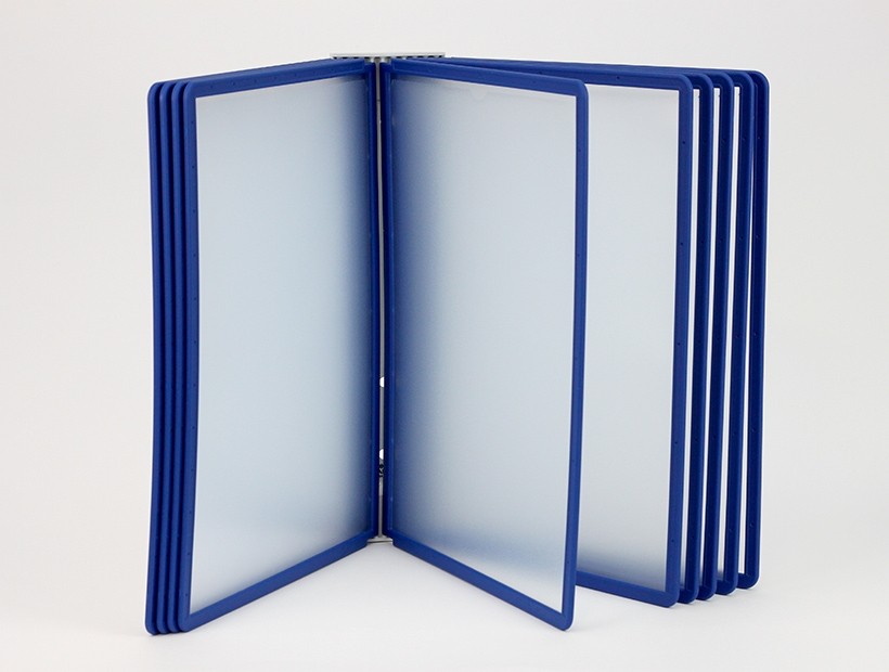 Sichttafel-System für Arbeitsschutzunterlagen oder Betriebsanweisungen mit 10 dokumentenechten DIN A4-Sichttafeln. Die geneigte Konstruktion verhindert unerwünschtes Zuklappen.