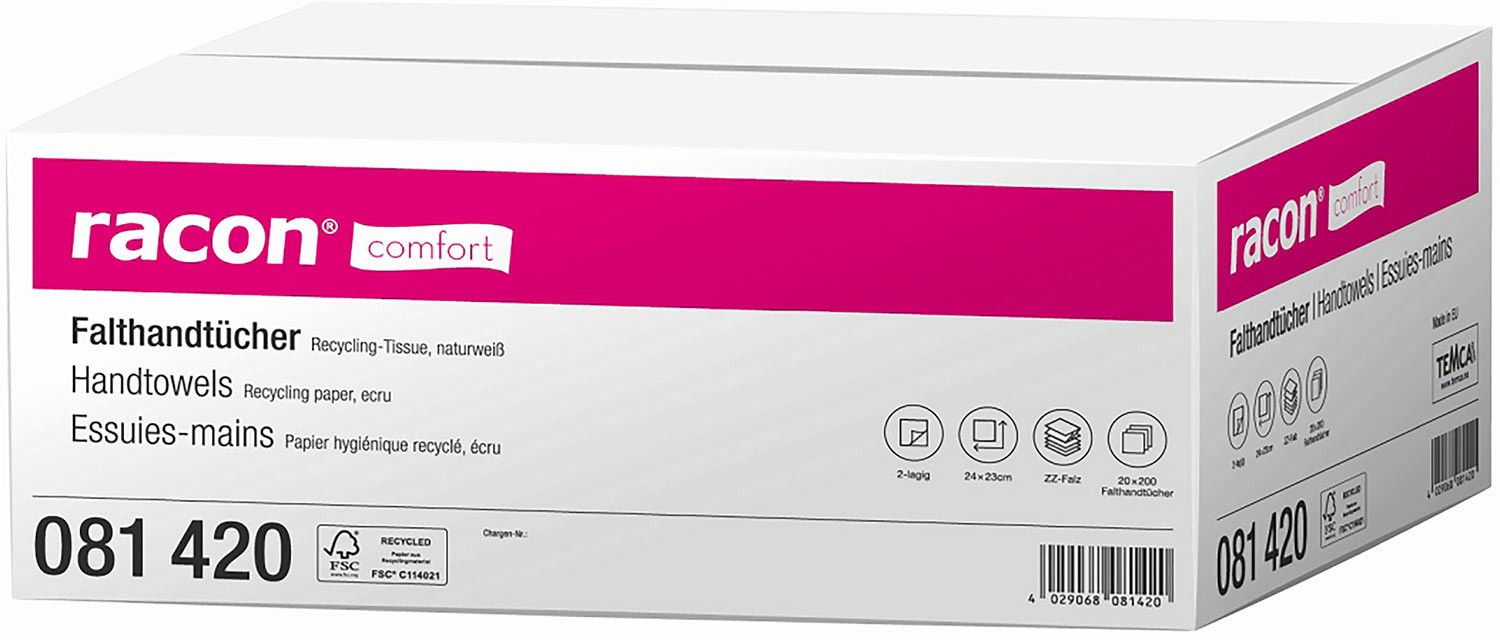 Die 2-lagigen Recycling-Tissue Falthandtücher eignen sich für Waschräume in hoch frequentierten Bereichen. Die Tücher sind extrem saugstark und passen in weitgehend alle gängigen Spendersysteme. Angenehm weich für die anspruchsvolle Händetrocknung.