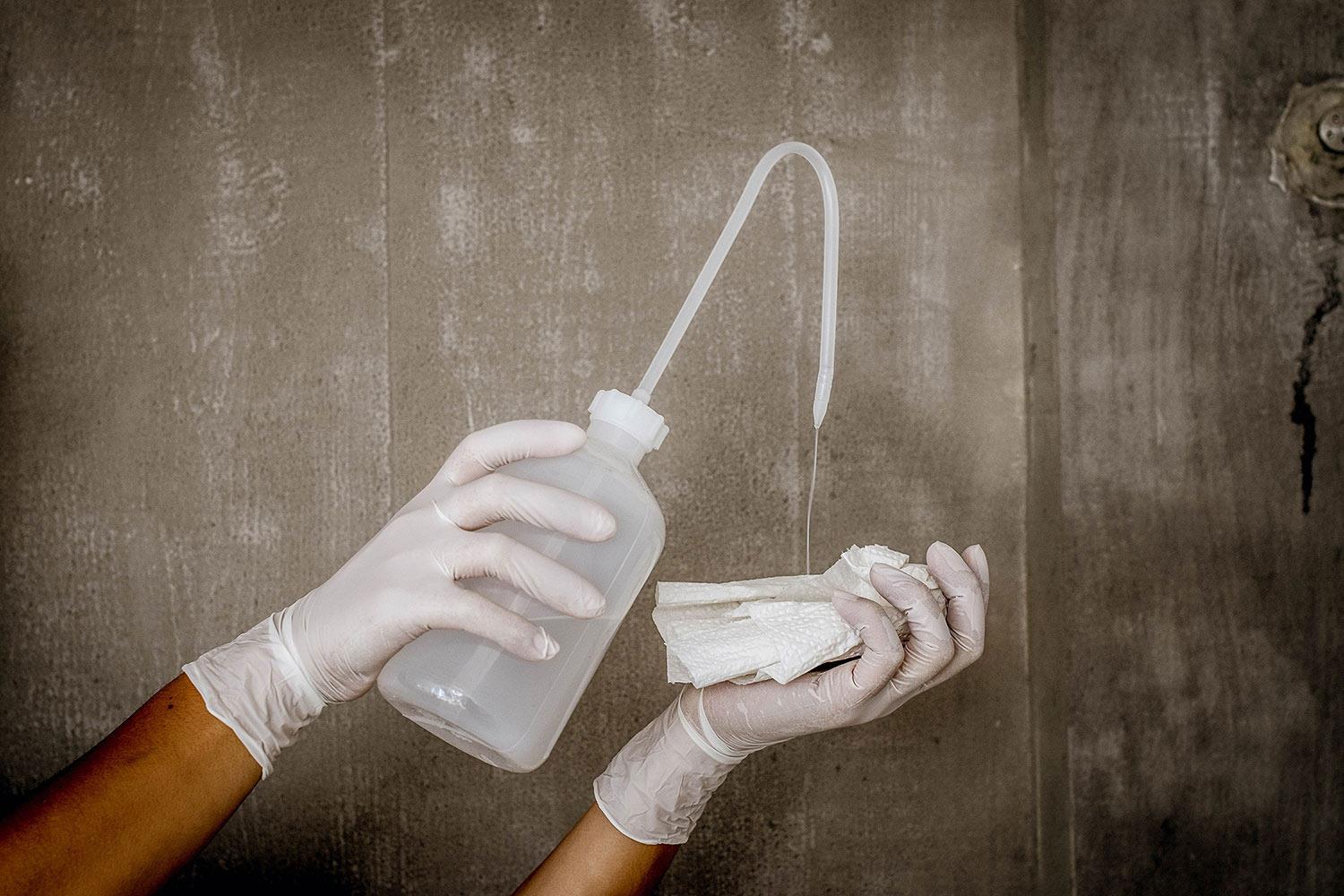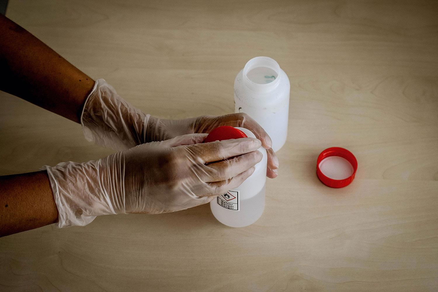Flüssigkeitsdichter Einweghandschuh bei der Verwendung vieler gebräuchlicher Chemikalien.